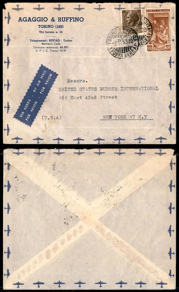 Aerogramma affrancato con 100 lire Italia al Lavoro (651) + 20 lire Turrita (714) da Torino a New York del 7.11.53