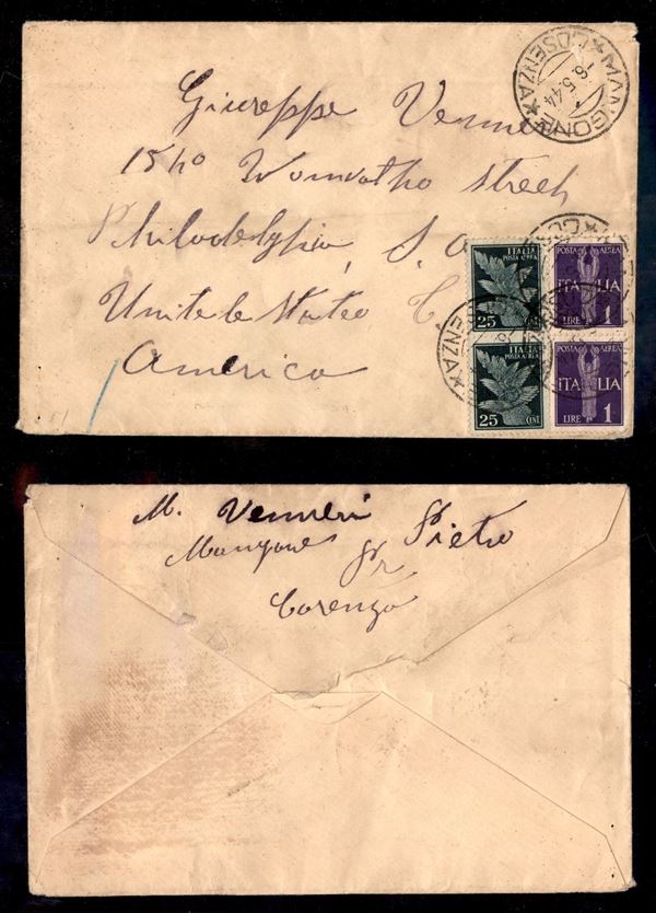Aerogramma da Mangone/Cosenza per gli USA del 6.5.44 (10 coppia + 14 coppia - Aerea)