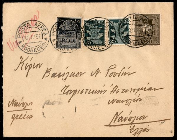 Aerogramma da Rodi a Atene del 30.12.36 con affrancatura mista (60 + 62 + Regno 10 + 10 Aerea)