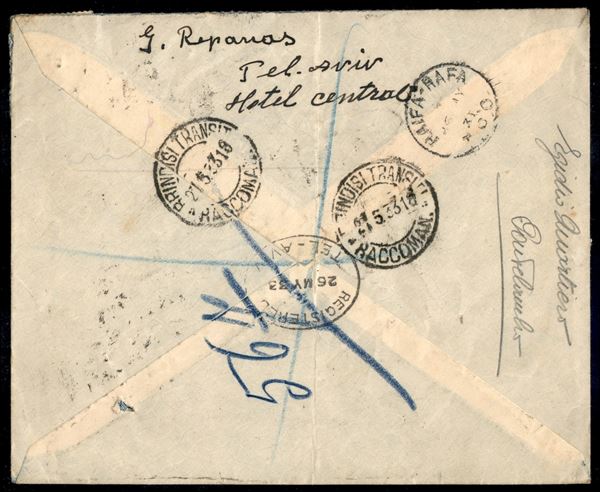 Aerogramma raccomandato da Tel Aviv a Milano del 26.5.33