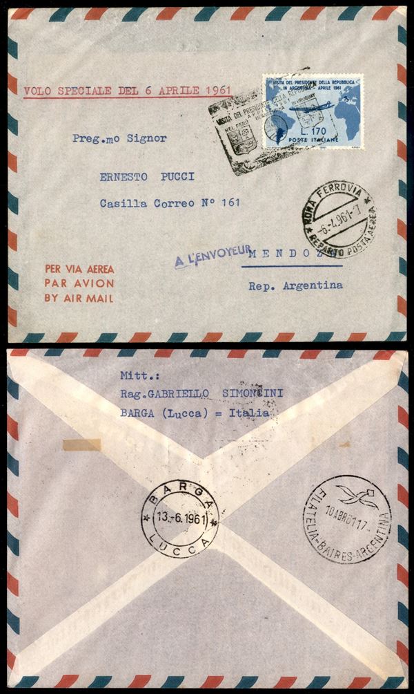 Aerogramma volo speciale Presidente Gronchi 6.4.61 - affrancato con il 170 lire (918) diretto a Mendoza e qui rispedito al mittente