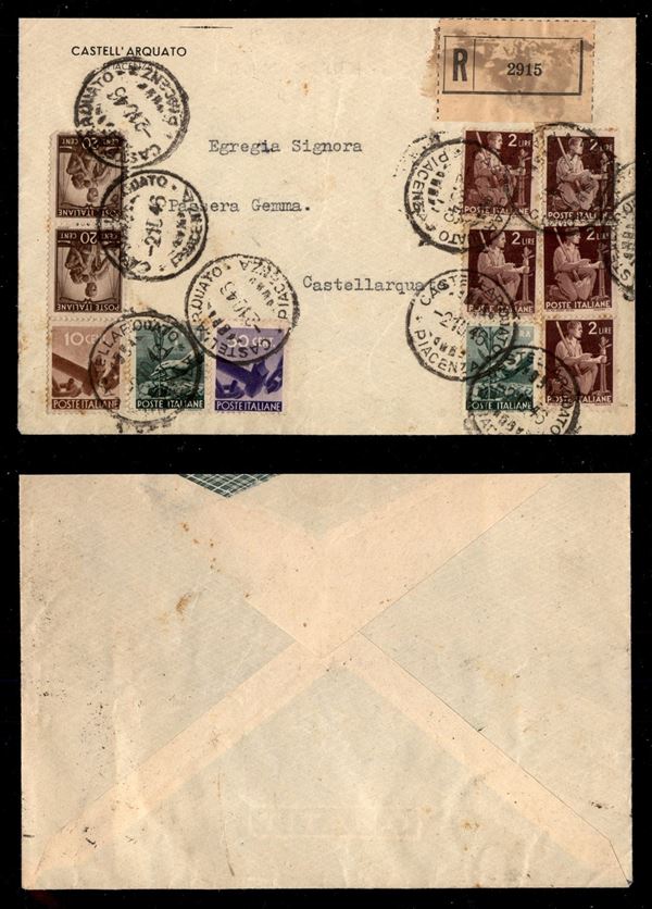 Affrancatura multipla (543 + 544 due + 547 + 550 due + 552 cinque) su raccomandata per cittą - Castellarquato 2.10.46