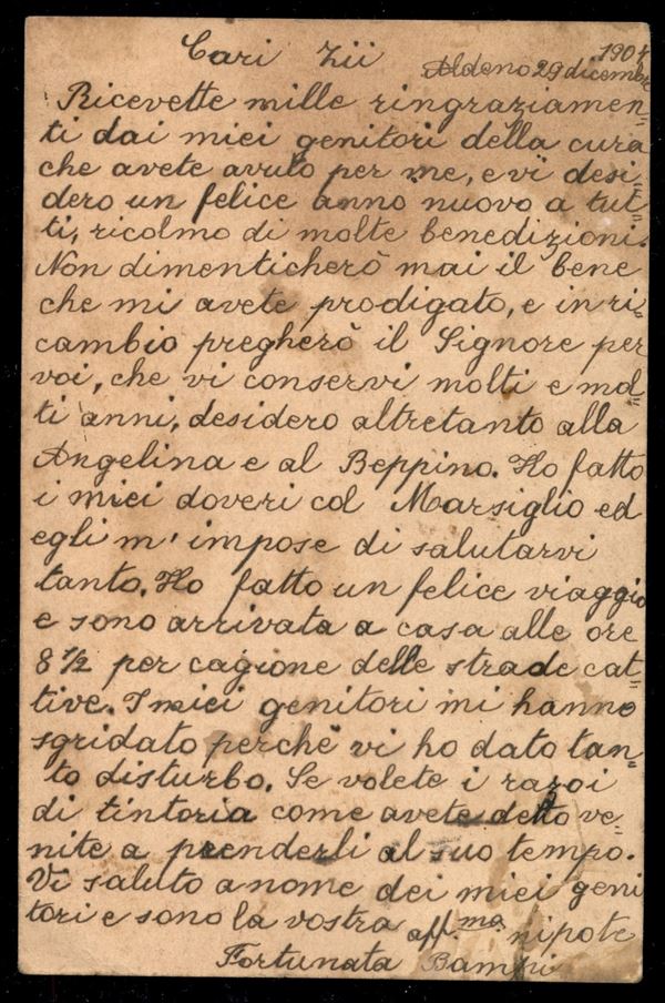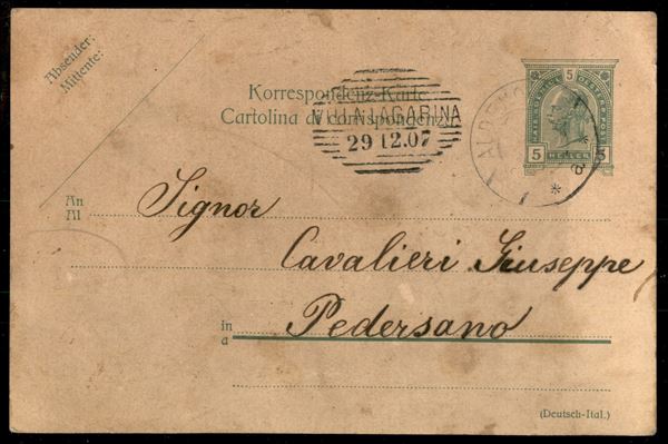 Aldeno - cartolina postale per Pedersano del 29.12.1907
