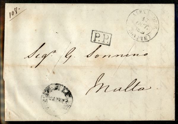 Alexandrie + P.P. + Purifie au Lazaret Malta - lettera del 16.10.1841 con tagli di disinfezione