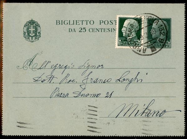 Amb. Roma Genova 132 B - biglietto postale da 25 cent (B31) con complementare gemello (248) per Milano del 2.2.1939