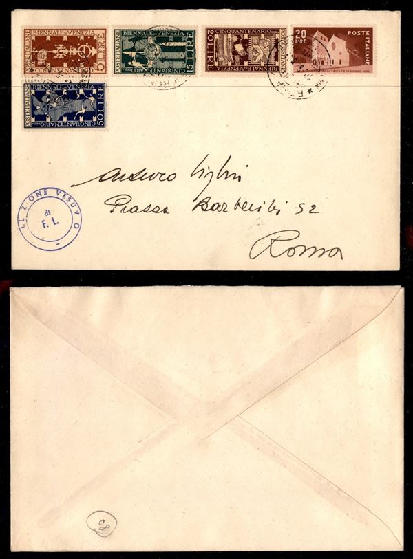 Biennale (594/597) + 20 lire Trieste (606) su busta da Roma del 10.6.49 per cittą