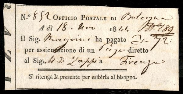 Bologna 18.11.1844 - ricevuta di assicurata per Firenze
