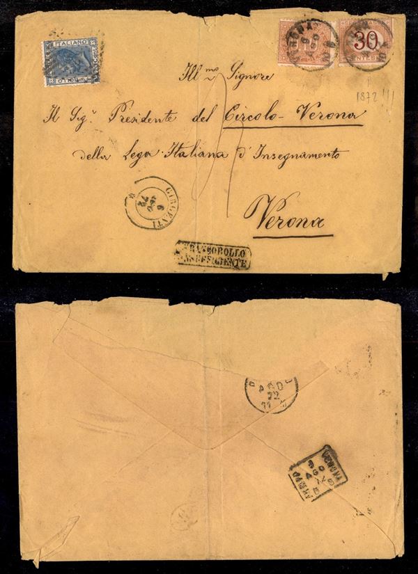 Busta da Girgenti a Verona del 6.8.72 col 20 cent (26) tassata in arrivo per 40 cent (2+7 difettoso in angolo all'origine - segnatasse)