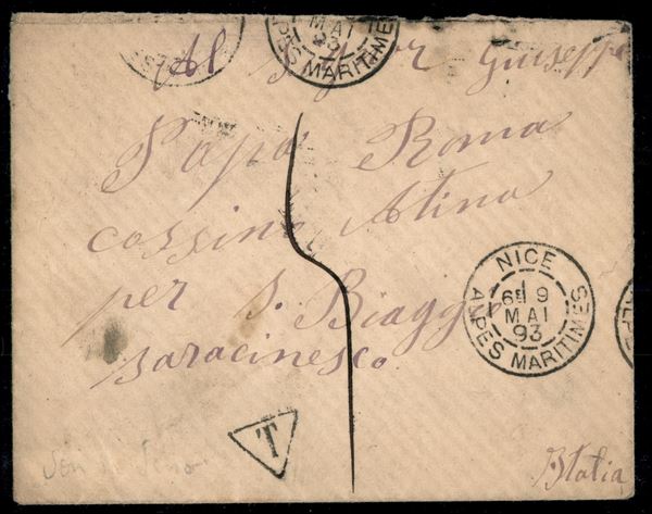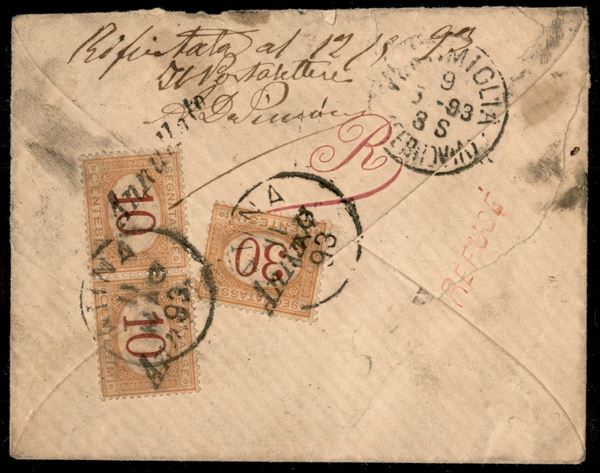 Busta da Nizza a Atina del 9.5.1893 tassata in arrivo al retro (21 coppia + 23 - Segnatasse) - Refusè in rosso al retro