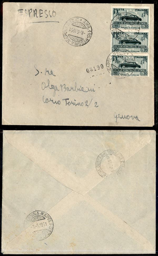 Busta espresso affrancata per 60 lire con striscia di tre del 20 lire Salone Automobile (655) da Napoli a Genova del 8.6.51