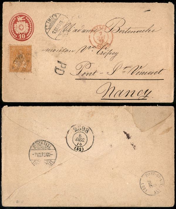 Busta postale da 10 cent con complementare da 20 cent (24) da St. Imier a Nancy del 7.12.75 - Alfani