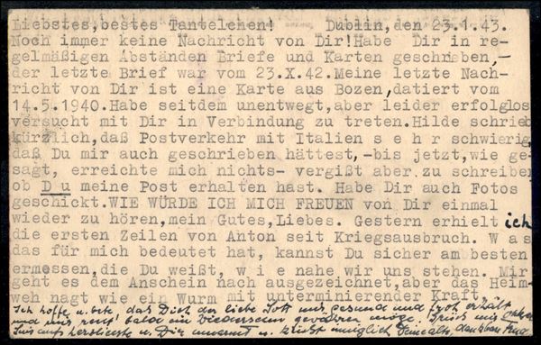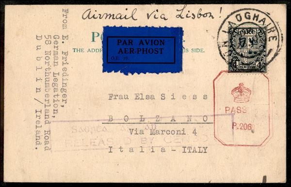 Cartolina aerea dalla Legazione Tedesca di Dublino a Bolzano del 23.1.43