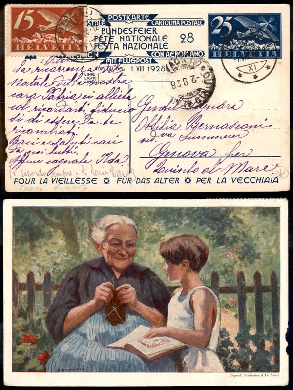 Cartolina postale da 25 cent (Per la Vecchiaia) con complementare (179) da Chiasso a Genova del 1.8.28