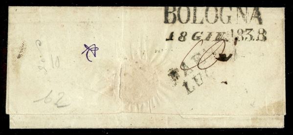 Chiari (ripassato a penna all'epoca) + Regno Lombardo Veneto - involucro di letterina per Bologna del 17 giugno 1838 inoltrata a Lugo - tassata