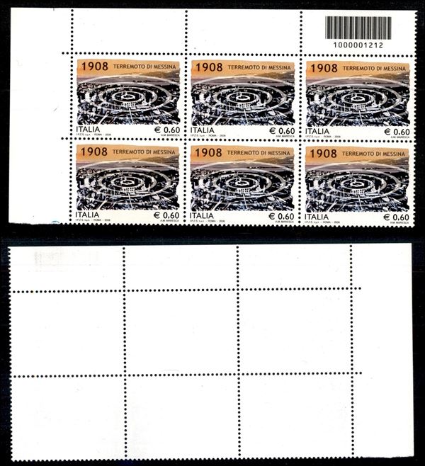 Codice a barre 1212 - blocco angolare di sei 0,60 cent Terremoto di Messina 2008 - gomma integra