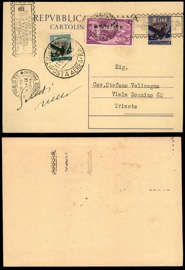 Congresso Filatelico - Cartolina postale da 8 lire (C9) con complementari (19+30) - per cittą del 11.9.48 con annulli speciali