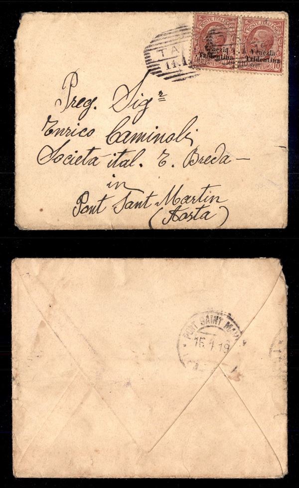 Coppia del 10 cent (22) su busta da Tajo a Pont S. Martin del 11.11.19 (400)