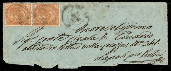 Coppia del 10 cent (L17b) su frontespizio di bustina per Napoli del 16 mar. 68 (mese capovolto)