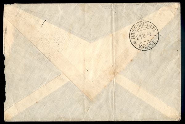 Coppia del 50 cent Leopardi (16) + coppia del 50 cent (4 Aerea Cirenaica) difettosa a destra - busta da Bengasi a Varese del 25.8.32