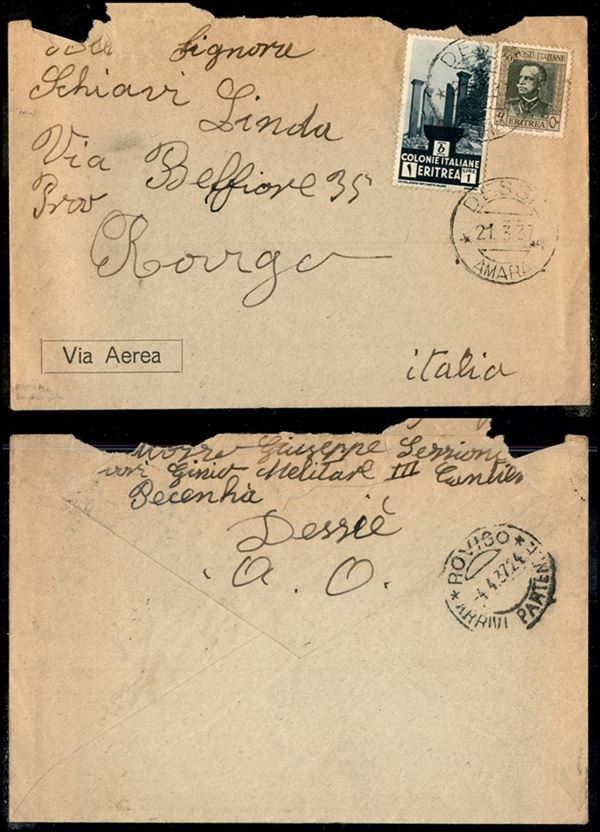 Dessič Amara (P.ti 11) - aerogramma per Rovigo del 21.3.37 (199 + 209 - Eritrea)
