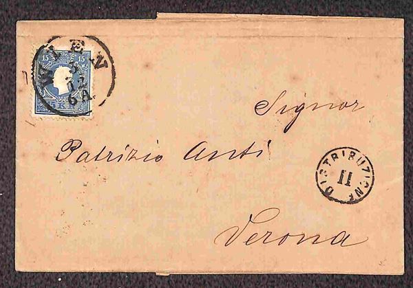 Distribuzione II (P.ti 4) apposto in arrivo a Verona - cinque lettere da Vienna col 15 kreuzer (15/II) del 1860/1861
