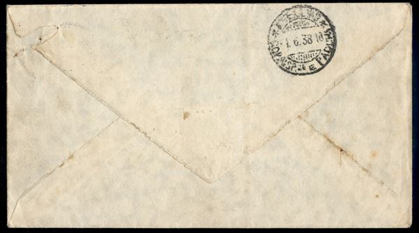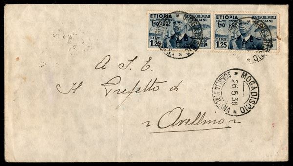 Due 1,25 lire (7) su busta da Mogadiscio a Avellino del 26.5.38 - fori di punto metallico sul pezzo di destra