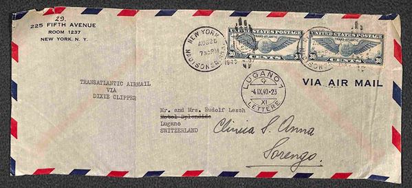 Due 30 cent (450) su aerogramma (via Dixie Clipper) da New York a Lugano del 26.8.1940
