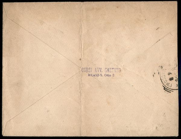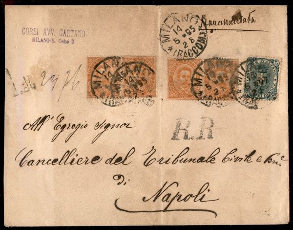 Due coppie del 20 cent Umberto (39) + 5 cent Stemma (59) - raccomandata da Milano a Napoli del 14.5.1895