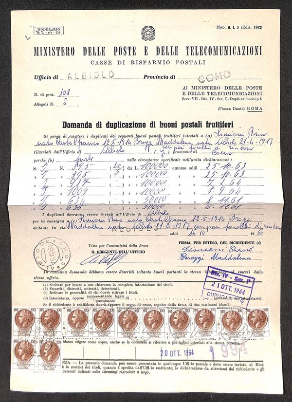 Duplicazione Buoni Fruttiferi - dodici 100 lire Turrita (873) su intero modulo - Albiolo 16.10.64