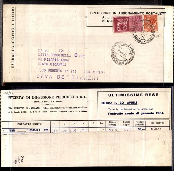 Estratto Conto Editori - Espresso da Milano a Cava dei Tirreni del 1.4.64 (764 + 34 Espressi) - cert. Carraro