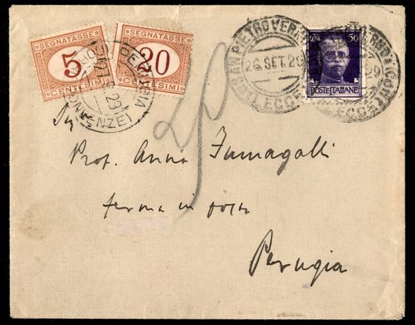 Fermo posta - busta col 50 cent Imperiale (251) dsa Lucca a Perugia del 26.9.29 con tassa di 25 cent (20+22)