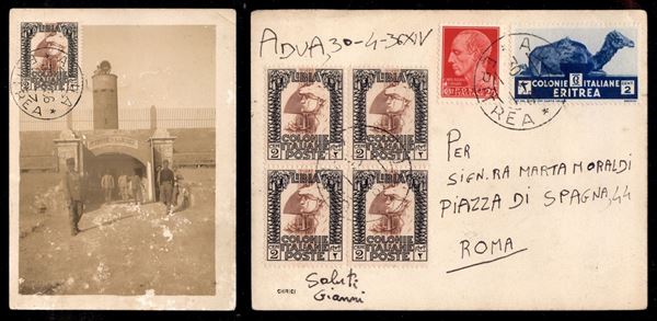 Forte Luesci - cartolina fotografica da Adua a Roma del 30.4.36 con affrancatura mista fronte retro (45 + 45 quartina + 203 Eritrea + 247 Regno)