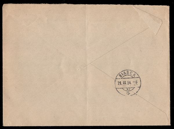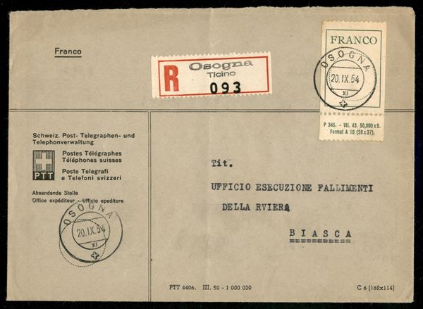 Francobolli in Franchigia (IV) su raccomandata da Osogna a Biasca del 20.9.1954
