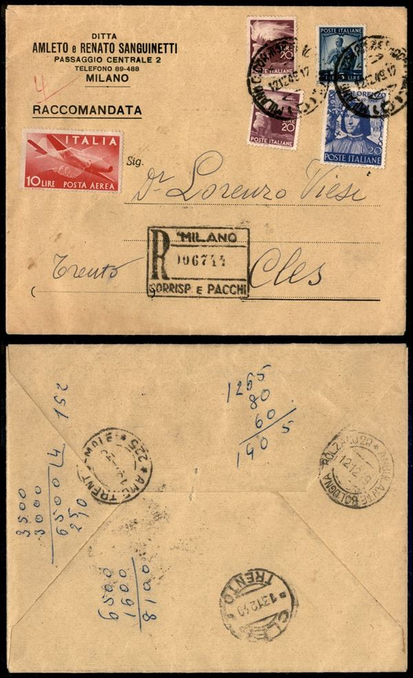 Gemelli - Democratica (555 + 561 due) + 20 lire Magnifico (608) + 10 lire Aerea (130 - sfuggito all'annullo) - raccomandata da Milano a Cles del 12.12.49