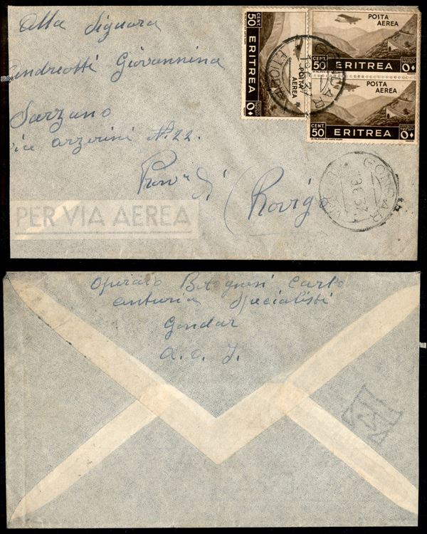 Gondar/Etiopia (P.ti 5) - tre 50 cent Pittorica (18 - Aerea) su busta per Rovigo del 19.6.37