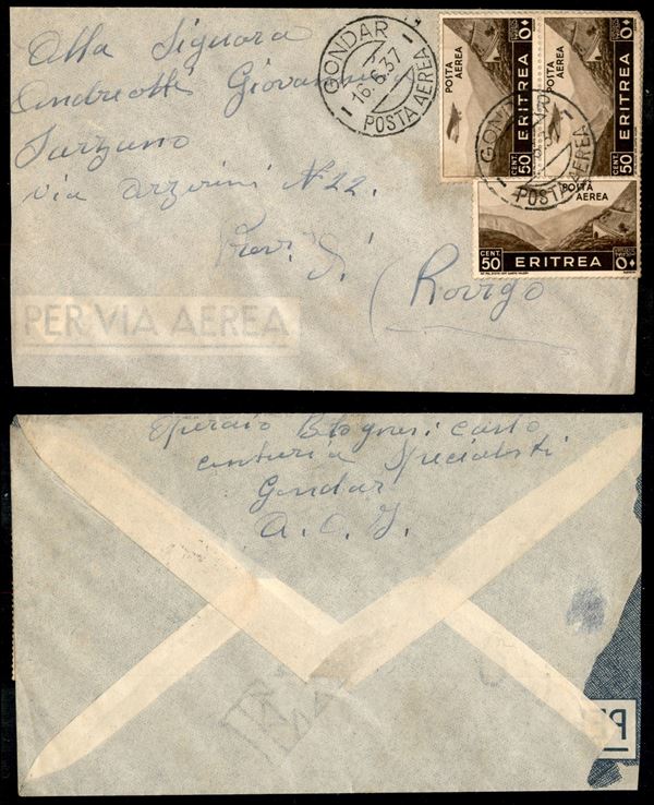Gondar/Posta Aerea (P.ti 6) - tre 50 cent Pittorica (18 - Aerea) su busta per Rovigo del 16.6.37