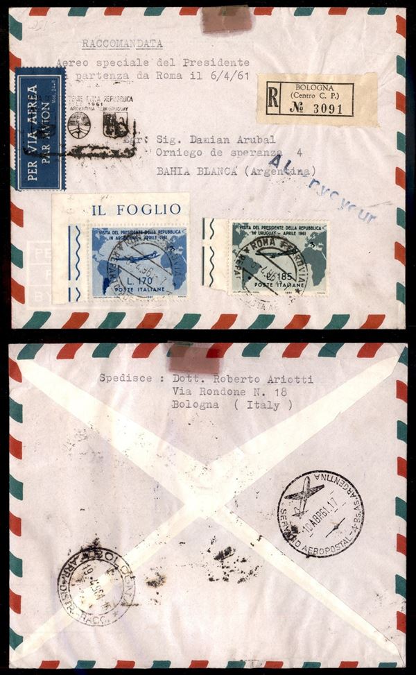 Gronchi (918 + 919) - aerogramma raccomandato da Roma per l'Argentina del 6.4.61