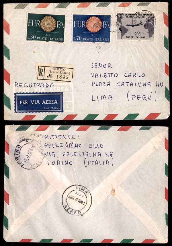 Gronchi (920 + complementari) - aerogramma raccomandato da Roma a Lima del 6.4.61