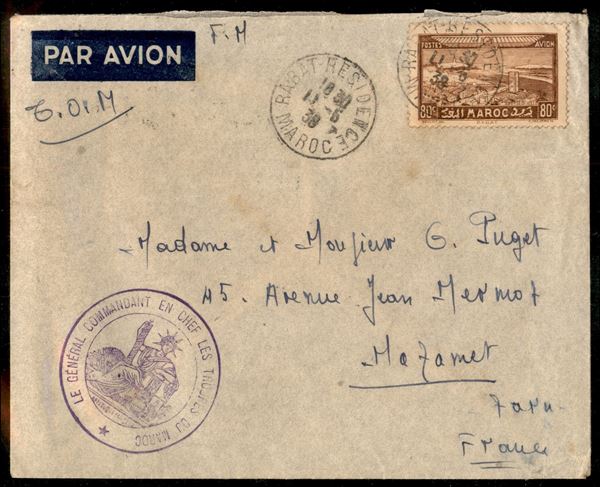Le General Commandant en Chef les Troupes du Maroc - aerogramma da Rabat a Mazamet del 11.6.1938