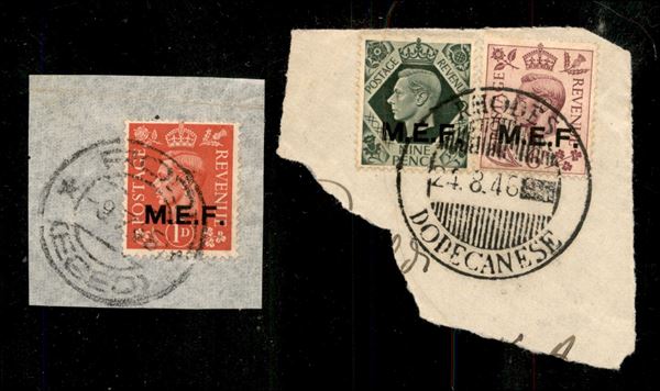 M.E.F. - 2 frammenti con diverse affrancature (6 - 11 + 12) usate a Rodi (luglio/agosto 46)