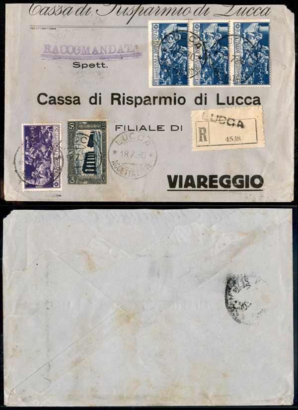 Milizia (273) + Ferrucci (278 + 279 striscia di tre) - raccomandata da Lucca a Viareggio del 18.7.30