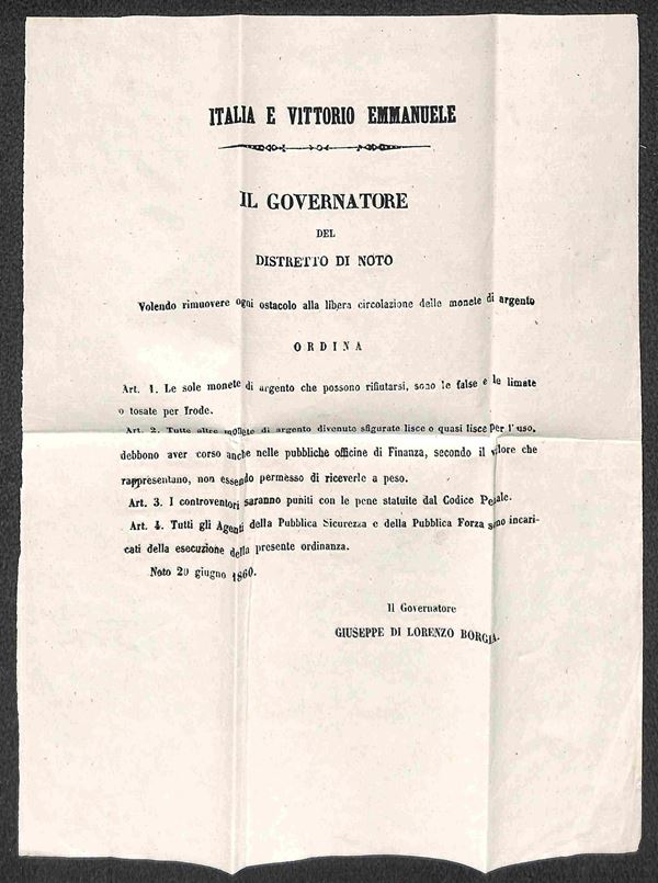 Noto + Servizio Pubblico - piego del 21 giugno 1860 per Buscemi contenete locandina sulla libera circolazione delle monete d'argento
