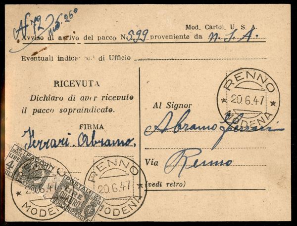 Pacchi postali - 4 lire (63) applicato a cavallo dei bordi di cartolina avviso - Renno 20.6.47