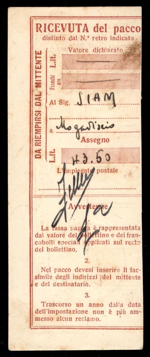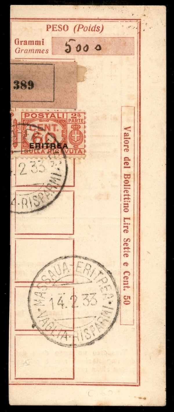 Parte destra del 60 cent (26 - Pacchi Postali) su ricevuta di bollettino da Massaua (Vaglia Risparmi - P.ti 8) a Mogadiscio del 14.2.33