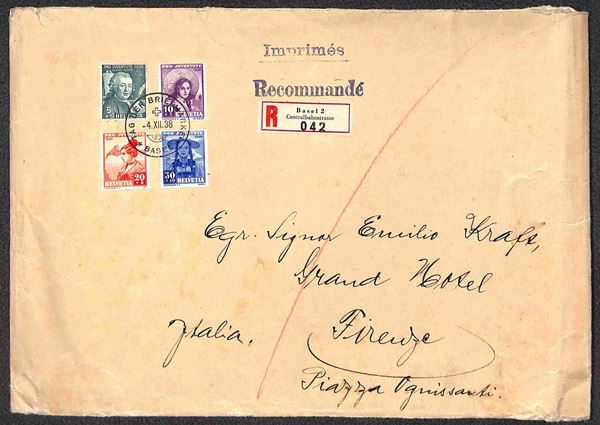 Pro Juventute (331/334) - serie completa su raccomandata da Basilea a Firenze del 4.12.38 con annullo speciale