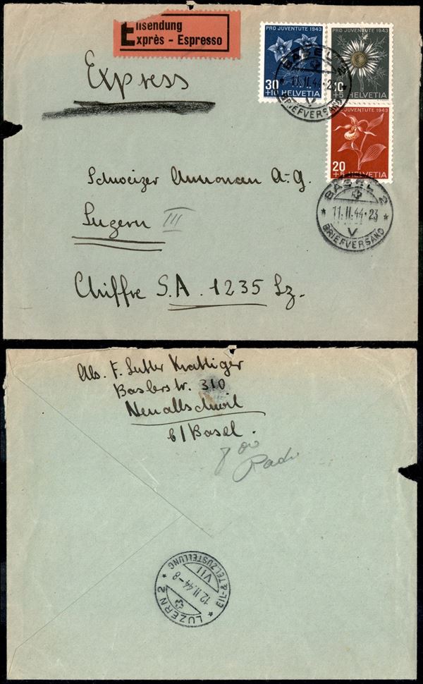 Pro Juventute (425/427) - 3 valori su espresso da Basilea a Lucerna del 11.2.44