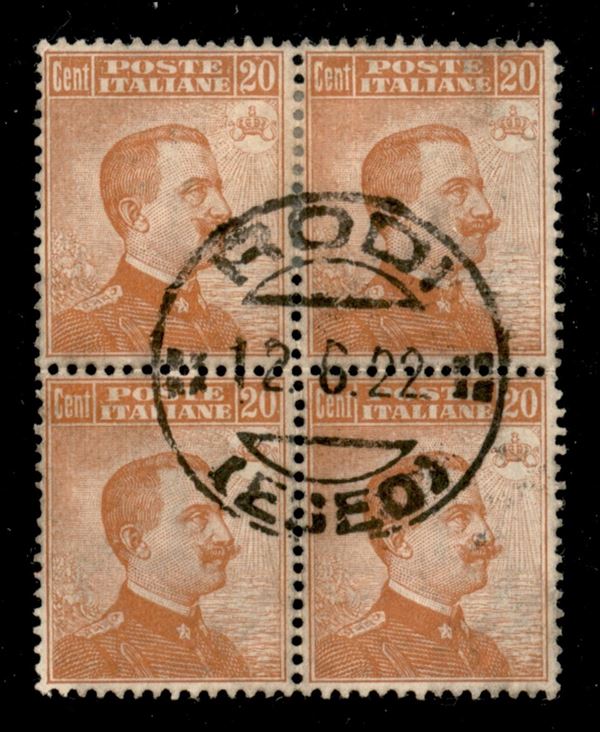 Quartina del 20 cent Michetti (109 - Regno) usata a Rodi 12.6.22