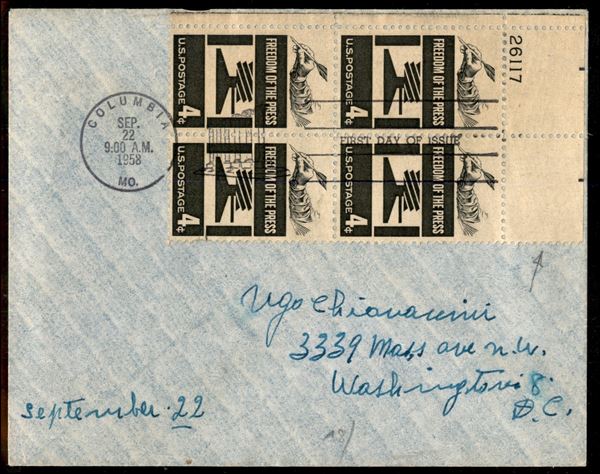 Quartina del 4 cent (738) angolo di foglio con numero di Tavola - busta da Columbia a Washington del 22.9.1958