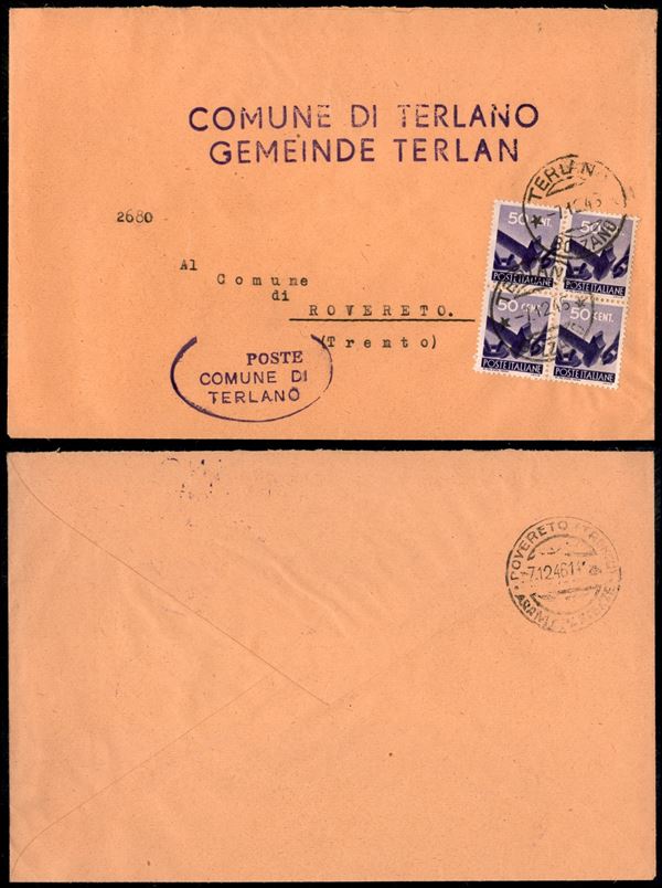 Quartina del 50 cent Democratica (547) su busta da Terlano del 7.12.46
