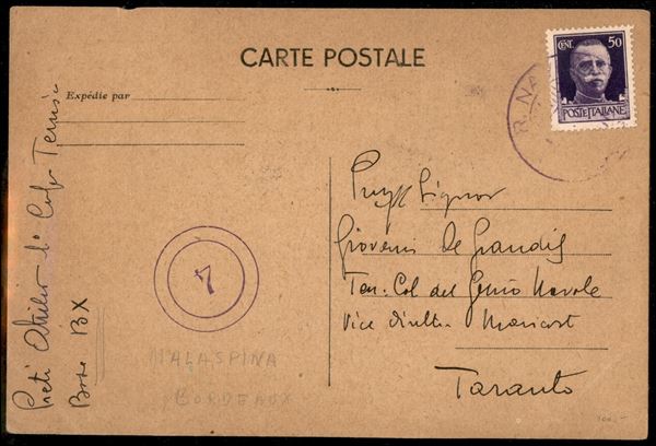 R. Nave (Malaspina) in viola - cartolina affrancata (251) da Bordeaux a Taranto